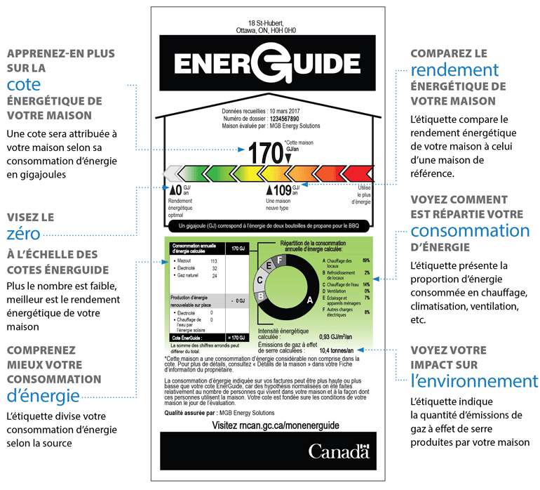 La cote ÉnerGuide, exprimée en Gigajoule (Gj), reflète l’efficacité énergétique d’une habitation. Après une visite à domicile, un conseiller en efficacité énergétique vous achemine un rapport d’évaluation qui comprend tous les aspects qui ont trait à l’efficacité énergétique: isolation, étanchéité à l’air, performance des systèmes de chauffage, de ventilation et de climatisation, ainsi que les habitudes de consommation d'électricité des occupants. Elle offre aussi une bonne référence pour comparer l'efficacité énergétique des habitations entre elles.