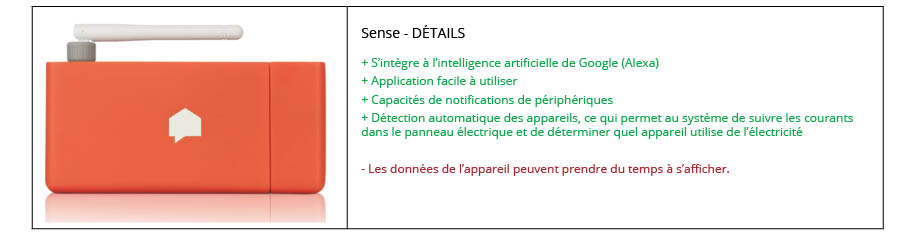 Un appareil à auto-apprentissage installé dans le panneau électrique qui permet de mieux comprendre votre consommation d’énergie et vos activités domestiques. Il peut également partager ses données avec d’autres appareils Sense et il reconnait, et différencie, les appareils de la maison.
