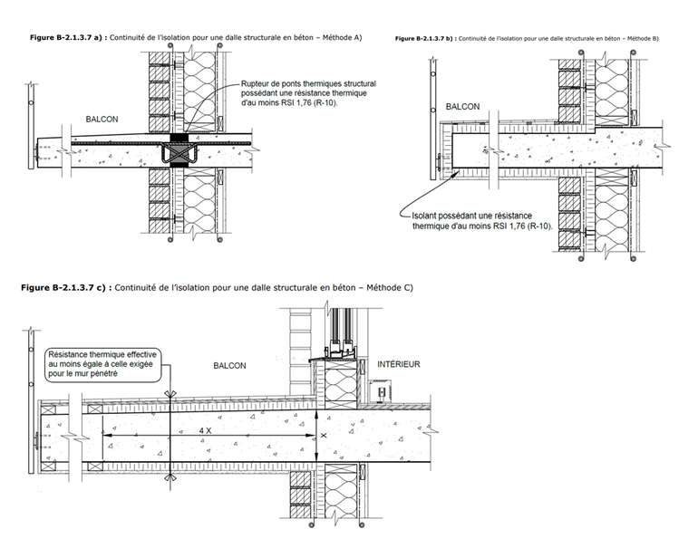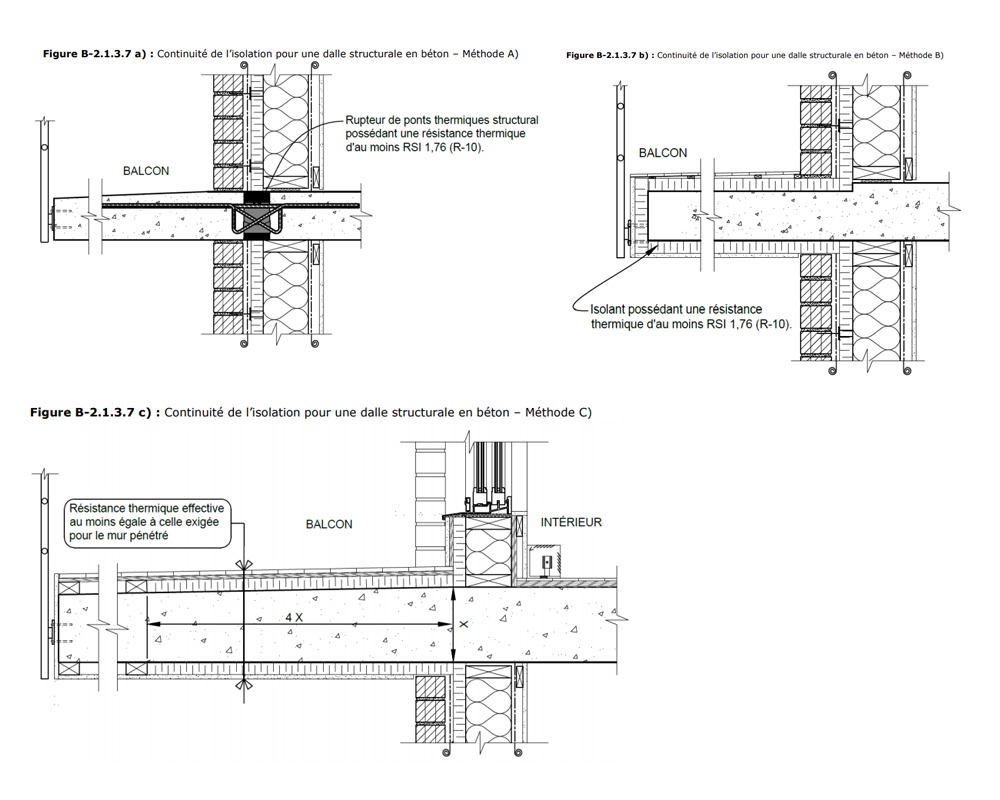 - en séparant le balcon de la structure avec un rupteur de ponts thermiques structural d’au moins R10;