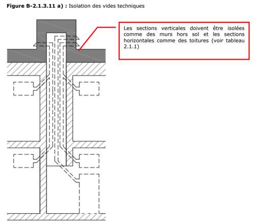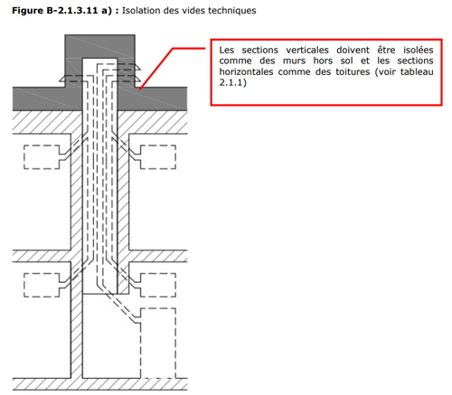 Deux autres détails constructifs sont revus et corrigés par Novoclimat. Tout d'abord, le programme formule des exigences spécifiques quant aux bâtiments en structure de béton, typologie qui domine les grands bâtiments. Les vides techniques qui traversent un mur, un plancher, un plafond ou un toit exposé et prévus pour dissimuler les conduits de ventilation, tuyaux, câblage, etc. doivent être considérés comme des espaces non chauffés à l’intérieur du plan d’isolation, et donc être isolés commes des murs hors-sol ou toitures, selon l'espace en question. Ainsi, les désagréments des ponts thermiques sont corrigés.