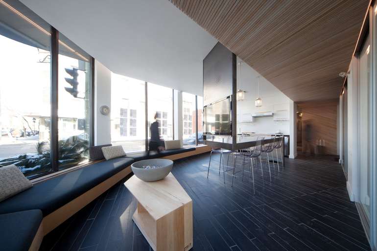 Situé au 1152 Mont-Royal, à Montréal, l’agence immobilière Via-Capitale du Mont-Royal s’est inspirée de notre programme Rénovation Écohabitation pour rénover ses locaux. Il suffit d’y passer pour toucher, voir et connaître des produits 100 % québécois. On aime particulièrement le plancher en ardoise locale, les luminaires LED fabriqués à partir de matière recyclée, les plafonds en érable certifié FSC et les choix de matériaux à faible émission de composés nocifs pour la santé et l’environnement.