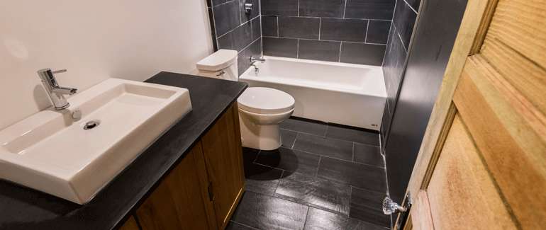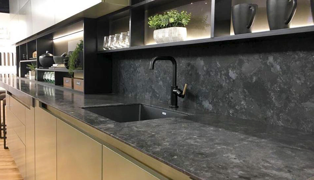 Le magnifique granite noir de la carrière de Saint-Nazaire est utilisé pour les comptoirs de cuisine et de salle de bain. Et comme les produits sont fabriqués ici, on adore ce look ténébreux made in « Chez nous ».