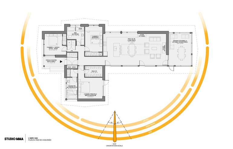 Cette pièce est aussi agrandie visuellement et fonctionnellement par la terrasse adjacente. Fermée au nord et du côté de la rue, cette terrasse est protégée des allées et venues de la rue par le corps du bâtiment. Une seconde aire de vie à part entière! En option, on peut installer une véranda avec moustiquaire au bout de la maison, ce qui offre un autre espace où l’on peut profiter de l’extérieur en paix. L’option est particulièrement intéressante dans les Laurentides et Lanaudière!