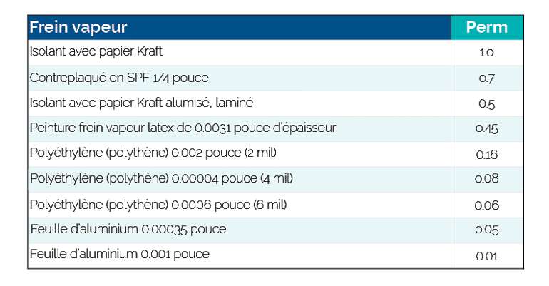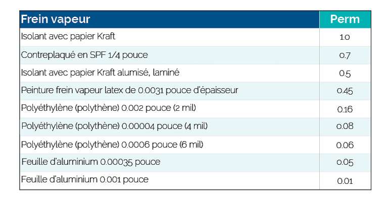 Le Code national du bâtiment du Canada stipule que, pour les bâtiments résidentiels, un pare-vapeur doit avoir une perméance à la vapeur d’eau de moins de 60 ng/(Pa•s•m2), ou 1 Perm. Ce qui signifie qu'un maximum de 60 nanogrammes de vapeur d’eau peut traverser 1 m2 de matériaux en 1 sec. (Les nanogrammes sont assez petits, soit un milliardième de gramme seulement).