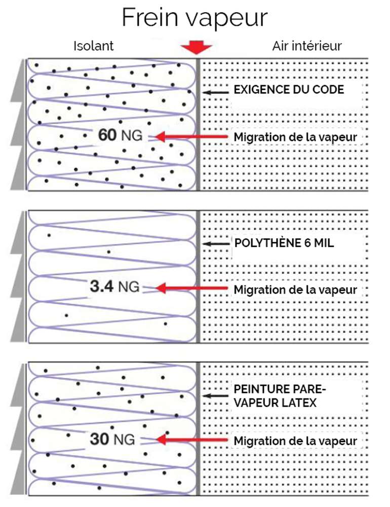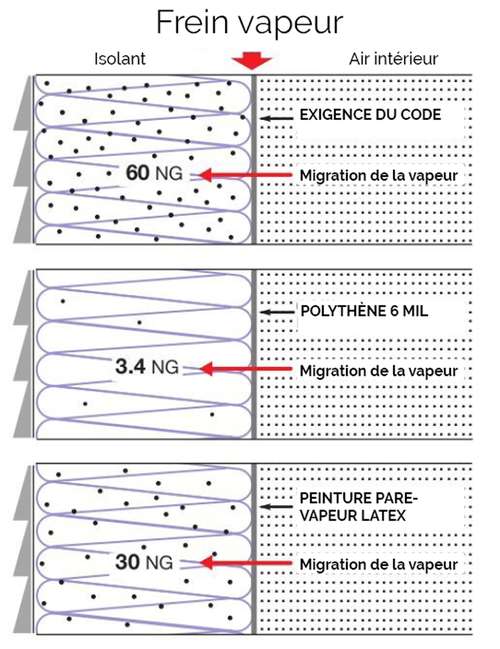 En tant qu'expert en peinture effectivement ce qui est écrit dans cette article est vrai, mais il y a des faits qui ont été omis. On parle de retrouver les valeurs de perms sur les étiquettes des produits, seul quelques produits ont passé les tests, les fabriquants ne donnent pas ces donnés que pour des peintures utilisé par les professionnels et ce n'est pas sur l'étiquette, peut-être sur la fiche technique et encore. Le problème qu'on rencontre souvent est que le polyéthylène a été oublié et on veut le remplacer par de la peinture. Pour obtenir la même valeur on doit plus que des apprêt "pare-vapeur", l'apprêt laisse passer 10 fois plus d'humidité que le polyéthylène a 6mm. Si les joints ne sont pas fait c'est plus économique d'enlever le gypse, mettre le polyéthylène qu'essayer d'avoir la même valeur avec de la peinture. Autre point qui n'est pas mentionner est qu'on ne mentionne pas que l'apprêt pare-vapeur devra être recouvert de couches de finition, bien qu'elles soient moins pare vapeur est ajoute une barrière pour l'humidité et aucun fabriquant de peinture ne test des systèmes de peinture avec l'apprêt et les couches de finition, donc on n'a aucune donnés. La peinture qui est la plus pare-vapeur que j'ai vu est le Noxyde de Rust-oleum avec 0.091perm avec 2 couches donnant 14 mils sec, soit environ l'équivalent de 8 à 10 couches de peinture. S'il y a des personnes interresser par ce sujet faite moi signe.