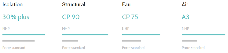 Ensuite, citons le double joint d’étanchéité intégral sur tout le périmètre de la porte qui réduit les infiltrations et les fuites d’air Jusqu'à 4 fois, comparé à une porte standard. Elle résiste aussi jusqu’à 540 Pa de pression aux infiltrations d’eau.