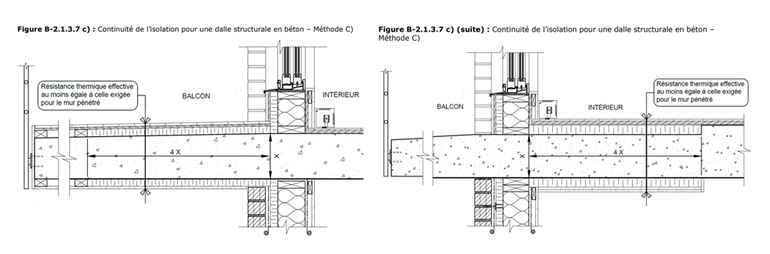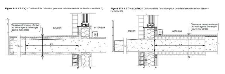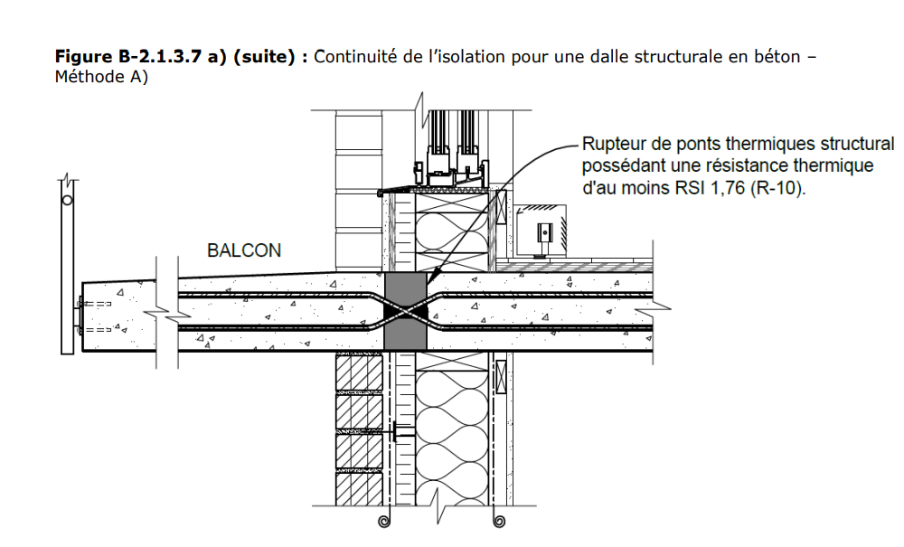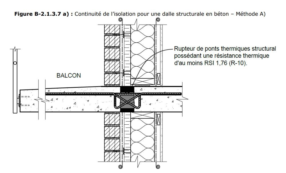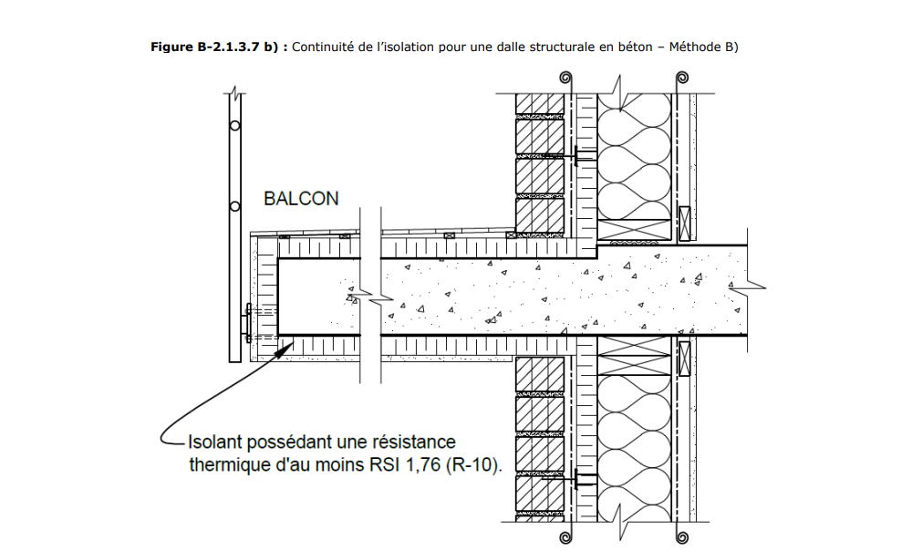 Lorsqu’une dalle structurale en béton (p. ex., dalle de balcon en porte-à-faux) pénètre un mur exposé, rompant ainsi la continuité du plan d’isolation, cette dalle doit être isolée selon une des méthodes suivantes: