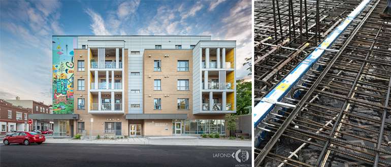 Lafond Côté Architectes a recours aux rupteurs de ponts thermiques couramment depuis environ 5 ans. Fondée en 1983 à Québec, et reconnue pour ses nombreux ensembles d’habitations de logements sociaux, la firme fait figure de précurseur dans le domaine de la performance énergétique. Dans tous leurs projets, les rupteurs thermiques utilisés pour les balcons sont spécifiés en structure ; les architectes de Lafond Côté collaborent avec Normand Biron de CIME Consultants.