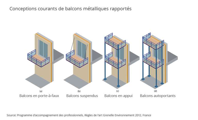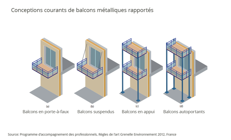 Les nouvelles constructions comportent trop souvent des balcons construits dans la continuité des dalles, à chaque étage. Comme ces plateformes de béton ne sont pas isolées et qu’elles pénètrent dans l’enveloppe d’un bâtiment isolé, elles font office de pont thermique entre l’extérieur et la structure qui les portent, chaude.