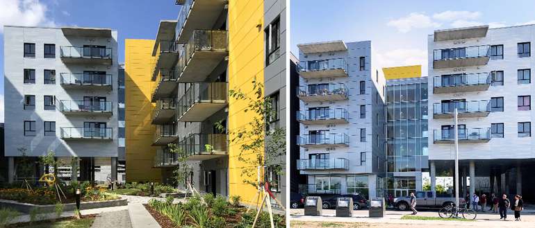 Citons aussi le projet de logements sociaux Un Toit Vert, réalisé en consortium avec TERGOS architecture. Situé dans le nouveau quartier écologique d’Estimauville, Un Toit Vert comprend un bâtiment de six étages comprenant 70 unités d’habitations abordables et adaptables. Conçu pour atteindre la certification LEED® Platine et Novoclimat Grand bâtiment multilogement. Les balcons, équipés de rupteurs de ponts thermiques, rythment les façades sans occasionner de ponts thermiques.