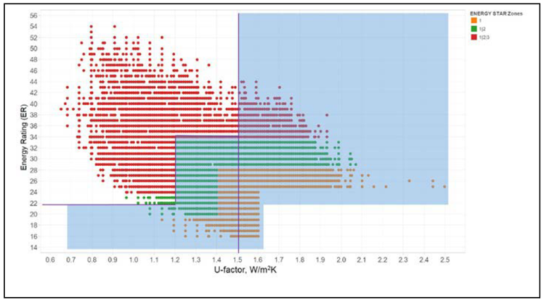 La version 4.1 établissait une liste de critères de performance plus ou moins exigeants selon la zone climatique. La nouvelle version 5.0 adoptant l’ancienne zone 3 à l’échelle du Canada, elle élimine donc les portes et produits de fenestration des zones 1 et 2 (jaune et vert sur le tableau ci-dessous) :