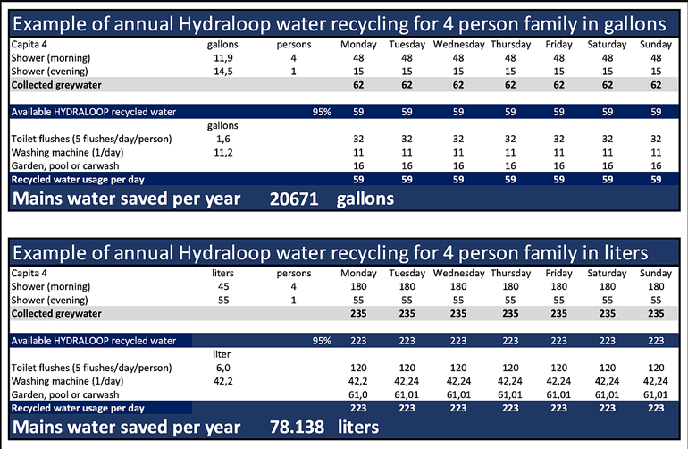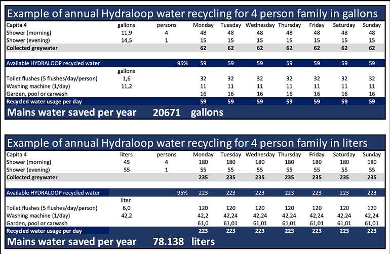 - Normalement, une famille de 4 personnes rince ses toilettes avec 34 gallons d'eau de ville/jour, à une température d’environ 7 °C. Cette eau froide acheminée à l'intérieur de la maison consomme de l'énergie pour être amenée à température ambiante. On dépense alors via le système de chauffage central. Avec un système Hydraloop ou Écovision d'AQUARTIS, les eaux usées recyclées desservant les toilettes sont à une température ambiante de + 20 °C. Aucune eau froide n'est importée, ce qui permet d'économiser de l'énergie et de l'argent.