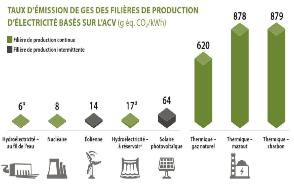 La certification Passive House et LEED® utilisent comme hypothèse la moyenne du réseau nord-américain ou européen de production énergétique. Ces moyennes comptent un pourcentage important de charbon et de gaz naturel, forts en émissions de GES. Le graphique ci-dessus illustre les taux d’émission selon les filières de production d’électricité. Ces hypothèses influencent grandement l’importance de l’énergie dans les certifications. Par contre, celles-ci sont peu réalistes si l’on regarde la situation du Québec, où 99 % du la filière énergétique provient de l’hydroélectricité générant très peu de GES.