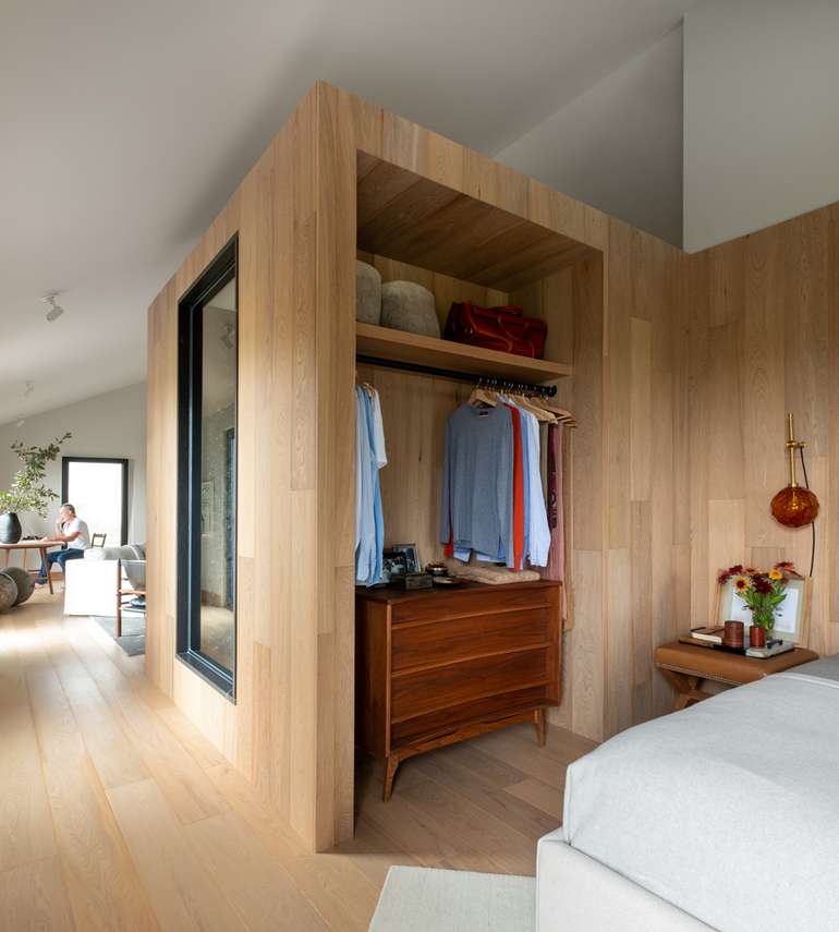 Le rez-de-chaussée est organisé autour des fonctions de production et de préparation agricole, alors que le deuxième étage est constitué de chambres et d’un atelier autour d’un foyer central inspiré de la typologie des maisons coloniales. Les murs extérieurs sont neutres et libres de divisions afin de maximiser l’expérience du panorama. La cuisine centrale, relie deux secteurs de la propriété tout en s’ouvrant vers l’extérieur : le bâtiment y a été percé par un axe vitré qui suggère une porte cochère, qu’on peut fermer par une porte coulissante monumentale.