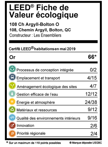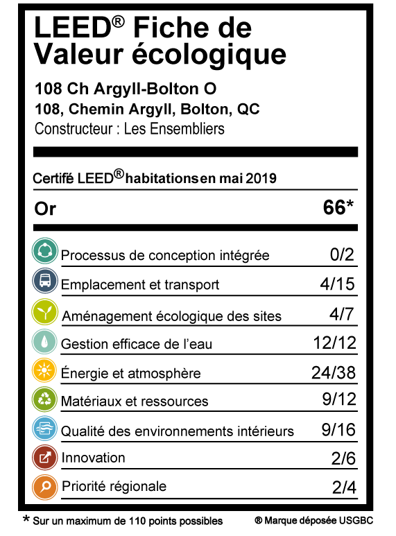 Le projet de rénovation résidentielle de la ferme, situé au 108, chemin Argyll à Bolton-Ouest, a obtenu la certification LEED® Or en 2019 (voir ci-dessous, la fiche de valeur écologique du projet). Entrevue LEED Or d’Évaluations Écohabitation avec Maxime Vandal.