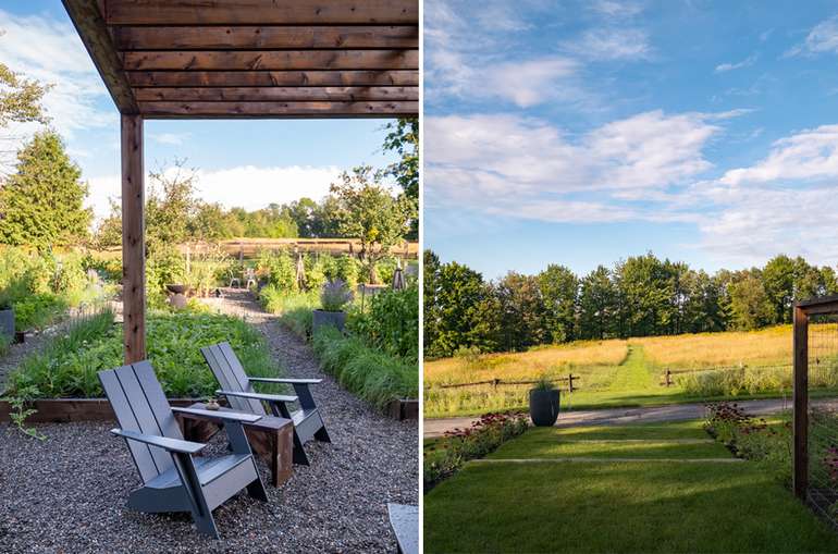Le potager est délimité par une clôture en cèdre massif au fini brut, reliée à la ferme par une pergola en cèdre massif, se fondant avec le bardeau de cèdre du revêtement.