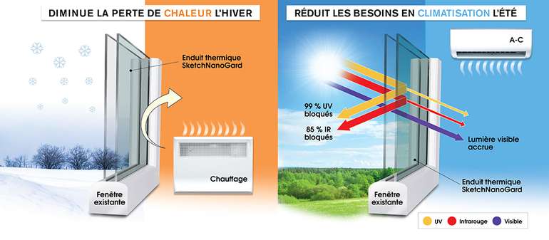 SketchNanoGard Thermique est un enduit transparent à appliquer directement sur le vitrage des fenêtres. Cette toute nouvelle peinture qui joue le rôle d'un isolant est très intéressante car elle permet d’augmenter les performances d’un vitrage thermos qui n'est pas doté de revêtement à faible émissivité. Le résultat approche la performance d’un vitrage muni d'une pellicule low-e!