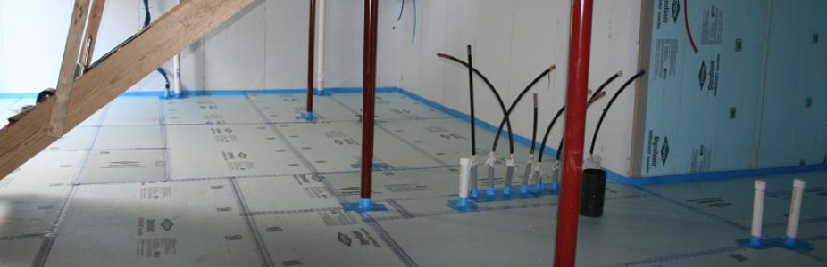 Un polythène 6 mil devra être posé sur le sol. Il freinera la montée de l’humidité et la pénétration du radon. On le fait remonter sur les murs, un peu au-dessus du niveau du sol. Il faudra bien sceller le tout, en faisant chevaucher les feuilles et en y apposant du ruban adhésif ou du scellant acoustique. Les feuilles devront également être scellées au mur, avec les mêmes produits.