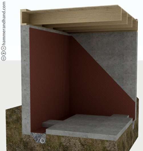 Une membrane élastomère ou un tapis doit être installé sur toute la surface du mur de fondation, et descendre jusqu’au drain français, de manière à acheminer l’eau au drain.