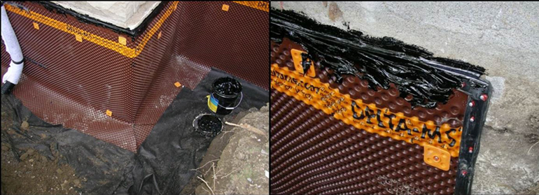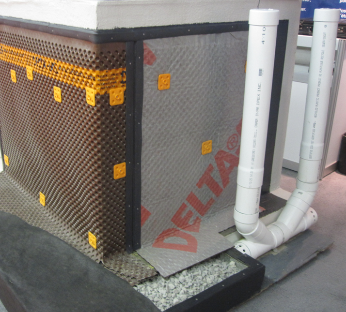 Recouvrez ensuite la membrane d'un tapis drainant alvéolé de type Delta-MS ou Soprema sur les murs extérieurs et les semelles jusqu’au-dessus du niveau du sol. À installer selon les recommandations des fabricants. On pose le matelas drainant contre la fondation, derrière les couches isolantes, ce qui permet de limiter toute pression d’eau contre le béton.