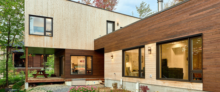 Travaillant de près avec les clients qui désiraient avoir une section à étage pour la jeune famille et une section de plain-pied pour les grands-parents, Quinzhee a proposé un plan original qui permet de conserver l'intimité tout en favorisant la proximité des familles. Côté design écologique, en tablant sur une grande fenestration qui fait face au sud, la firme a aussi su optimiser le design pour maximiser les gains solaires passifs en hiver tout en évitant la surchauffe estivale grâce à des pare-soleils, une terrasse et une pergola.