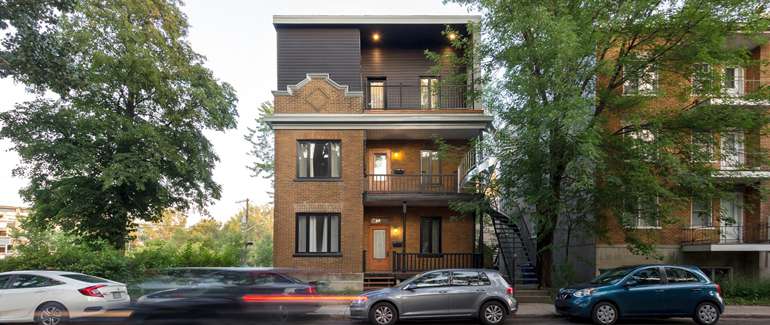 Ce duplex transformé en triplex n’accueille pas moins d’une « famille » par étage! Projet intergénérationnel et multifamilial, il a nécessité l’ajout d’un étage, d’un escalier intérieur et d’une terrasse sur le toit. Il constitue un excellent exemple d’agrandissement résidentiel : l’UHA attenante répond aux besoins des ménages, tout en s’intégrant dans le cadre bâti actuel et en densifiant le secteur de manière douce et respectueuse de son caractère architectural.