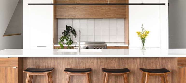 Un bloc central qui regroupe les éléments plus fonctionnels, comme l’entrée de style mud room, le garde-manger et la salle d’eau, tout en les gardant très accessibles. La cuisine trône au cœur de ce bloc central, avec son îlot et ses rappels de bois qui offrent des contrastes intéressants. Autres touches de bois dans la maison : les escaliers, la main courante et les rebords de fenêtres de la mezzanine à l’étage supérieur.