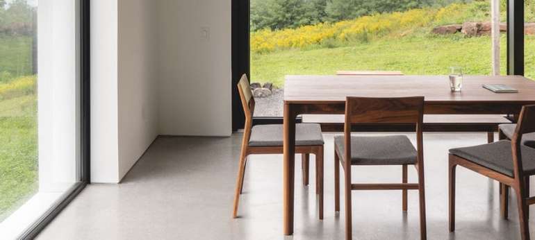 Le design intérieur de la maison Saltbox a été pensé selon un concept moderne et épuré. La pièce principale, spacieuse et lumineuse, grâce à ces larges baies vitrées et portes-patio en triple vitrage de NZP Fenestration, s’organise en un seul espace qui peut se vivre de différentes façons. Le plafond cathédrale et les murs blancs créent des jeux de lumière mettant le blanc dominant en valeur. Le plancher de béton contribue à la simplicité et au raffinement du design.