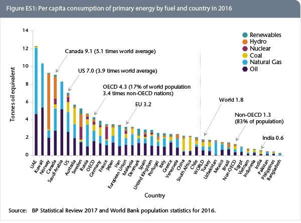 Les Canadiens sont de grands consommateurs d'énergie, avec une consommation par habitant cinq fois supérieure à la moyenne mondiale, 29 % supérieure à celle des États-Unis et près du triple de celle de l'Union européenne. Voilà pourquoi !