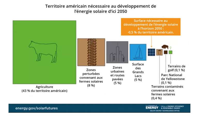 Si le manque d’espace peut représenter un argument contre la mise en place de fermes solaires, détrompez-vous. Cet énorme déploiement de panneaux solaires ne nécessitera qu’environ 0,5 % de la surface contiguë des États-Unis ! C’est très peu, surtout considérant le fait que les fermes seront principalement placées sur des terres perturbées, des toits, des plans d'eau, et dans des zones de culture ou de pâturage, et de manière à améliorer les habitats des pollinisateurs.