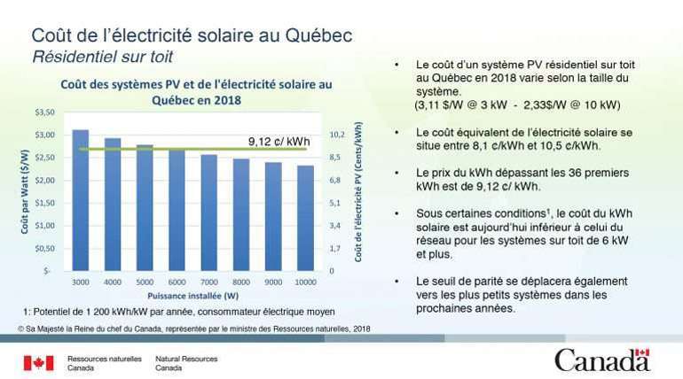 Ici, au Québec, l’hydro-électricité fournit une bonne part du marché. La production solaire, couplée à du stockage intelligent (dans des voitures électriques, par exemple), pourrait fournir une énergie en remplacement du mazout et du gaz naturel, de même qu’une réponse à la pointe énergétique et une façon écologique et économique de faire face aux pannes et aléas climatiques.