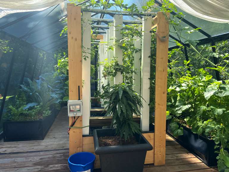 Spacieuse, la serre aquaponique de Marie-Michèle offre une hauteur de 6’ 6’’ et sa superficie de 240 pieds carrés environ permet d’accueillir de nombreux bacs au sol, des tours pour la culture verticale et des bassins pour les poissons. Il reste même de la place pour aménager un espace détente : « une chaise et une table invitent à profiter de l’ambiance zen et tropicale de l’endroit », commente Marie-Michèle. D’ailleurs, étant donné que la cour donne sur un coin de rue très passant, la serre attire de nombreux compliments des passants.