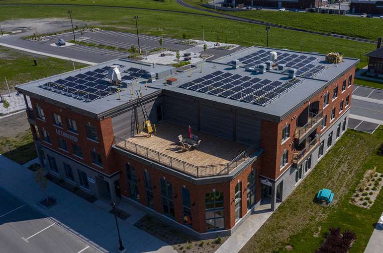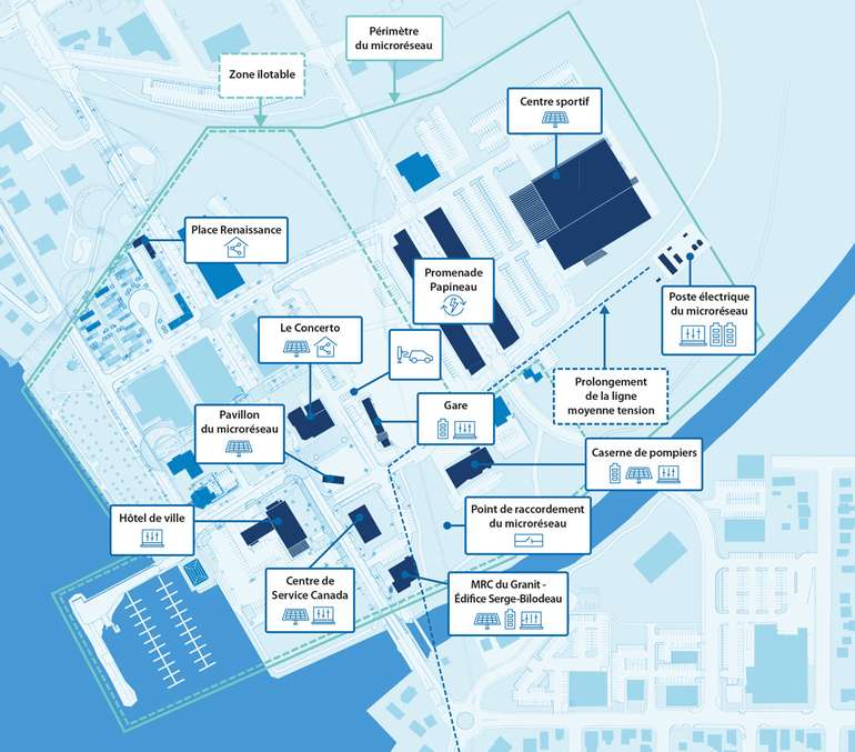 Outre le centre sportif et la gare patrimoniale, une trentaine de bâtiments résidentiels, commerciaux et institutionnels du périmètre sont reliés au microréseau, en parallèle avec le réseau d’Hydro-Québec. L’énergie produite par les panneaux alimente également une double borne de recharge pour les véhicules électriques. Ainsi, les bâtiments sur lesquels sont installés des panneaux solaires utilisent l’énergie directement et/ou la stockent. Les autres bâtiments du microréseau sont reliés aux batteries de stockage.