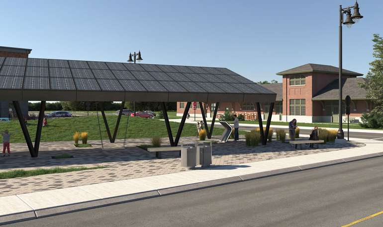 Plus visibles et accessibles à des fins de sensibilisation, 72 panneaux formant un abri solaire multifonctionnel ont intégré le paysage urbain au cœur du centre-ville. Cette installation alimente en énergie la gare patrimoniale voisine, tout en offrant aux citoyens un lieu de rassemblement ouvert à tous, à l’abri du soleil et de la pluie.