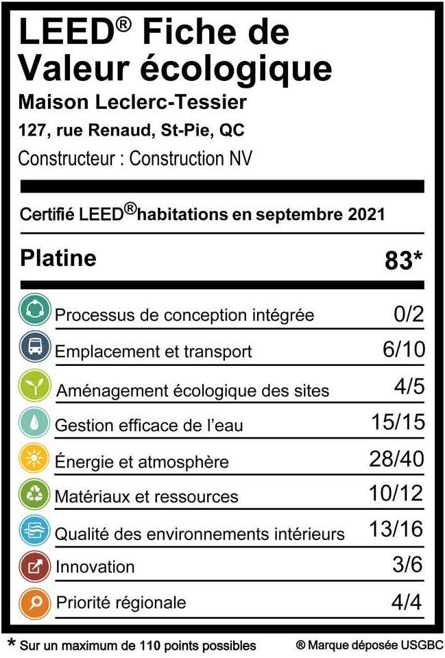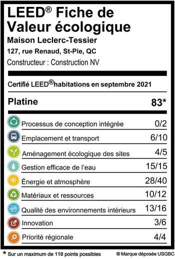 Pour Emmanuel Cosgrove, directeur d'Écohabitation et Évaluateur Senior LEED® Canada pour les habitations, Bruno et Stéphanie ont vraiment de quoi être fiers : « De l’extérieur, la maison semble très typique, se fondant dans son décor. Mais ça cache une montagne de travail et d’éléments écologiques. On peut le voir dans le système de pointage. On dirait vraiment que la famille et les concepteurs ont suivi nos articles et nos formations et qu’ils ont tout appliqué ! Je n’aurais moi-même pas pu intégrer plus d’éléments ».