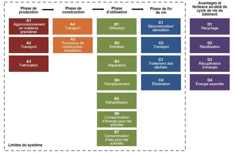 2 Bowick, M., O’Connor, J., Meil, J., Salazar, J., Cooney, R. (2022). Lignes directrices nationales en matière d’analyse du cycle de vie de l’ensemble du bâtiment. Conseil national de recherches Canada : Ottawa (Ontario). 137 p.