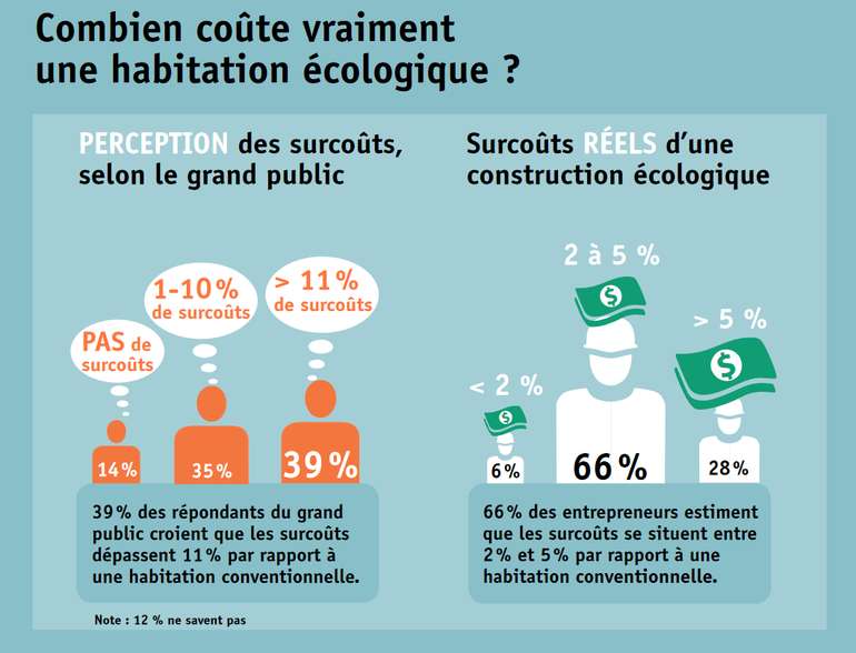 De plus, sachant que 66 % des entrepreneurs estiment que les surcoûts pour construire une maison écologique ne représentent que 2 % à 5 % par rapport à une habitation conventionnelle, et que 69 % des courtiers immobiliers considèrent qu'une maison écologique apporte une valeur ajoutée de 5 % à 15 % sur le marché, nous croyons fermement que la construction d'une maison écologique en vaut vraiment la peine et mérite davantage de réflexion ! [source]