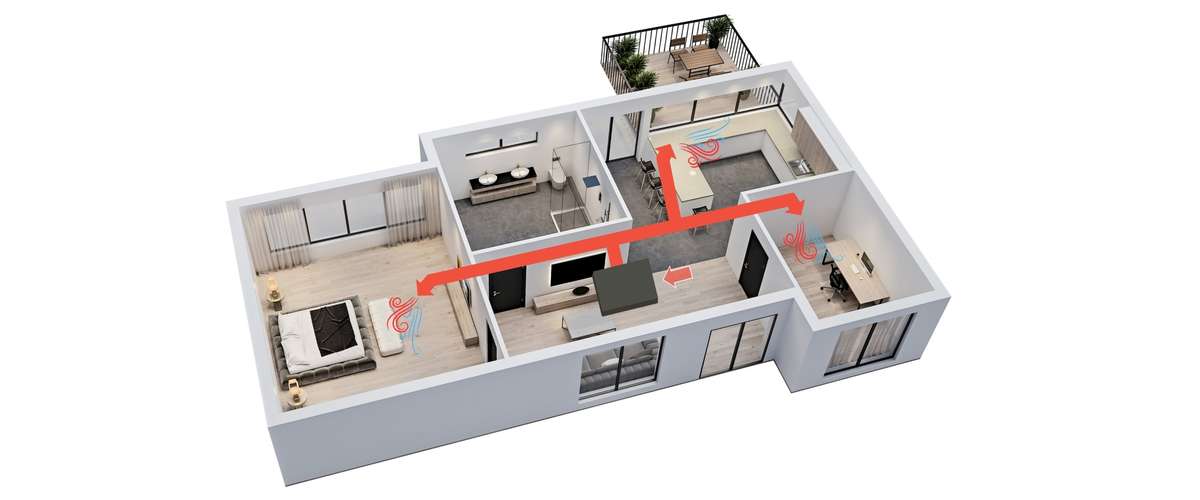 Une illustration parfaite de cette utilisation serait pour une maison sur deux étages, avec un rez-de-chaussée à espace ouvert dans lequel une thermopompe murale serait idéale, et un étage avec des chambres où une thermopompe gainable serait très intéressante. Il peut aussi peut être envisageable d’avoir une thermopompe murale pour votre espace ouvert et une thermopompe gainable pour les pièces fermées sur le même étage, tel qu'illustré ci-dessous.