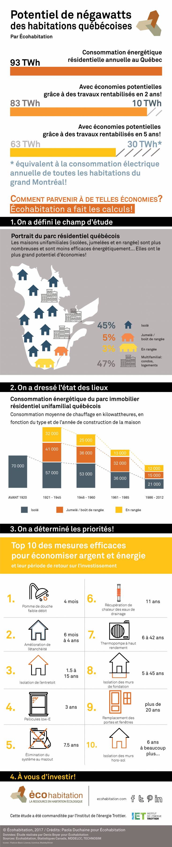 Février 2017. Négawatts des habitations québécoises : le potentiel technico-économique de réduction de la consommation énergétique et des des émissions de GES du secteur résidentiel au Québec. Avec l’ambition de révéler le réel potentiel des économies d’énergie, Écohabitation a réalisé une grande étude. Elle repose sur des hypothèses relatives à la consommation énergétique des habitations en fonction de leur année de construction et de leur type, et une évaluation du prix des travaux d’amélioration énergétique en fonction de leur état actuel.