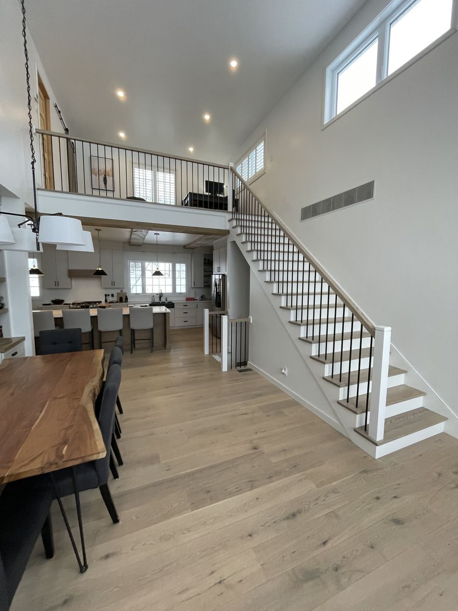 Rénovation majeure; ajout d'un étage et agrandissement côté lac en ossature de bois massif pré-teint. Recherches associées Salle à manger Sherbrooke (Estrie) Rénovation majeure Ajout étage Charpente massive Charpenterie Agradissement