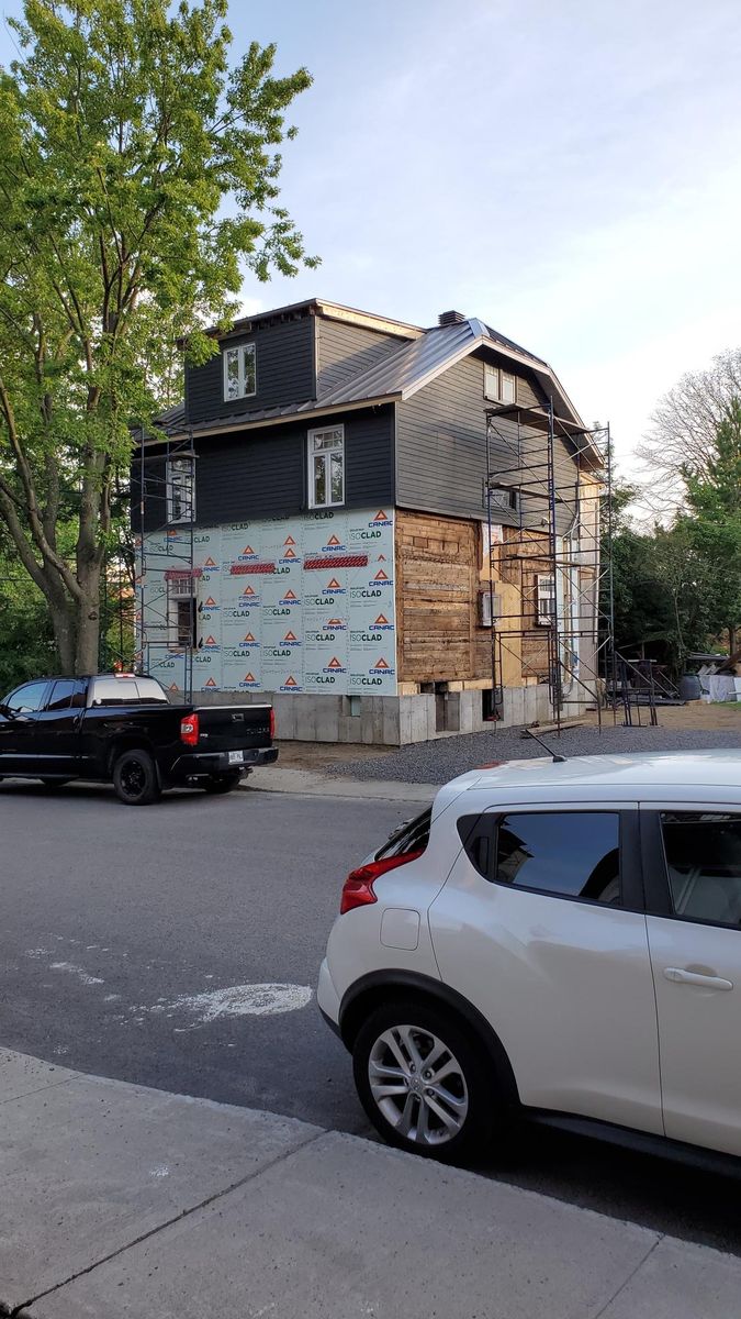 Les travaux extérieurs consistaient à refaire une nouvelle fondation ainsi qu'un ajout à l'arrière du bâtiment. La brique a été enlevée avec soin et nettoyée pour ensuite être réinstallée. Isolation des murs et installation de nouvelles porte et fenêtre. La toiture, autrefois, en bardeaux d'asphalte, a été remodelée et recouverte avec un revêtement de tôle. Galerie avant et toit de galerie refaite à neuf avec les exigences du patrimoine. Reconfiguration du rez-de-chaussé et insertion d'une poutre pour ainsi décloisonner les pièces. Fabrication et relocalisation des marches menant au sous-sol et corridor du rez-de-chaussé.