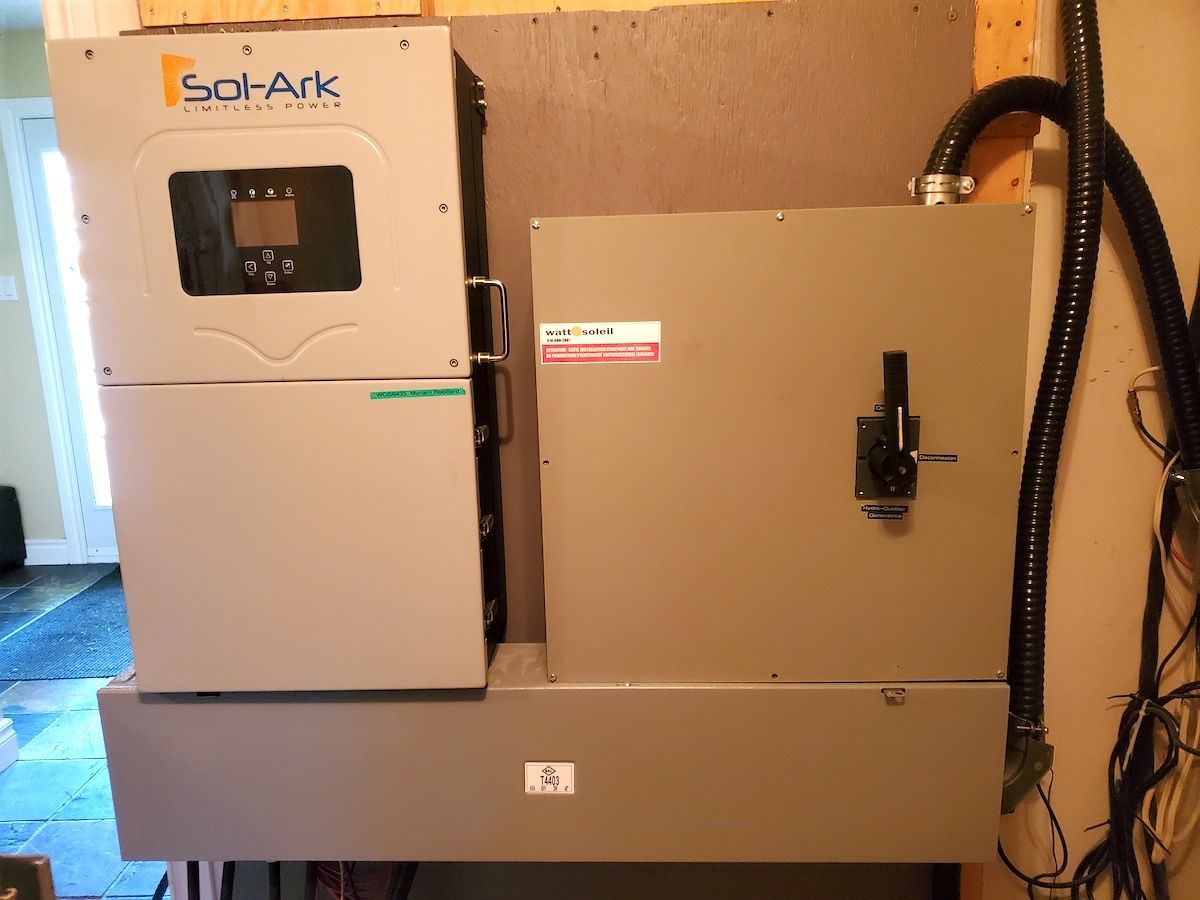 Installation d'un support au sol pour les panneaux solaires. MIse en place d'un onduleur hybride Sol-Ark pour une maison raccordée au réseau. *Projet en collaboration avec WattOSoleil et Photovolteck.