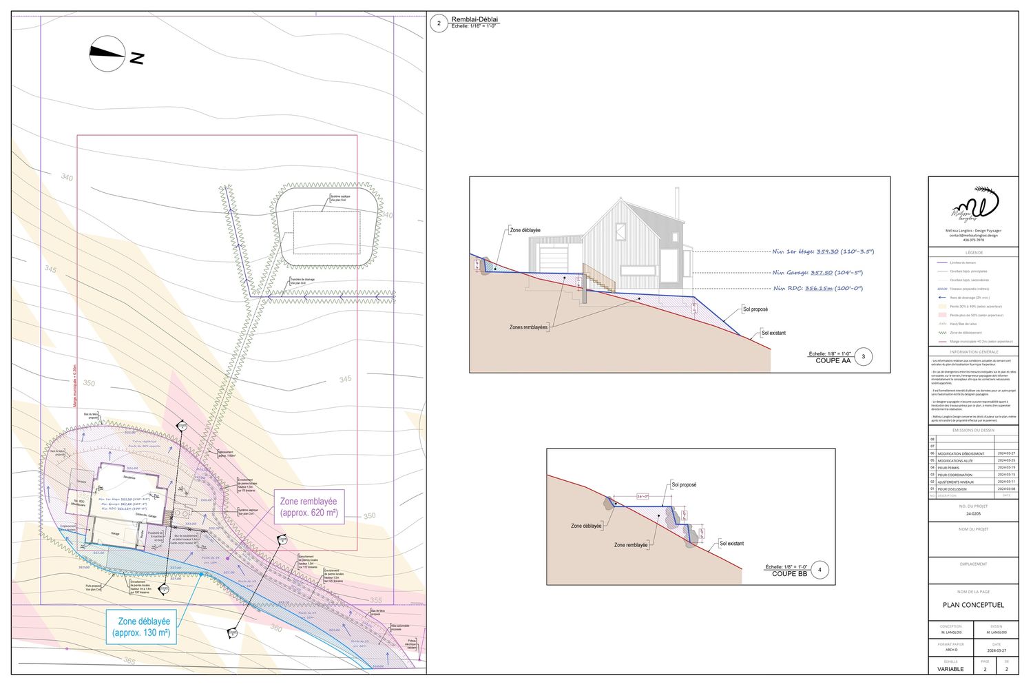 « Un plan et au minimum deux coupes topographiques réalisées par un architecte paysagiste ou tout autre professionnel compétent localisant: a. Les zones de remblais et de déblais; b. Le niveau du sol actuel et projeté; c. Les axes de drainage des eaux de ruissellement; d. Les arbres qui seront abattus; e. Tout autre type d’ouvrage réalisé dans le talus (ouvrage de rétention d’eau, végétalisation, enrochement, etc.) »