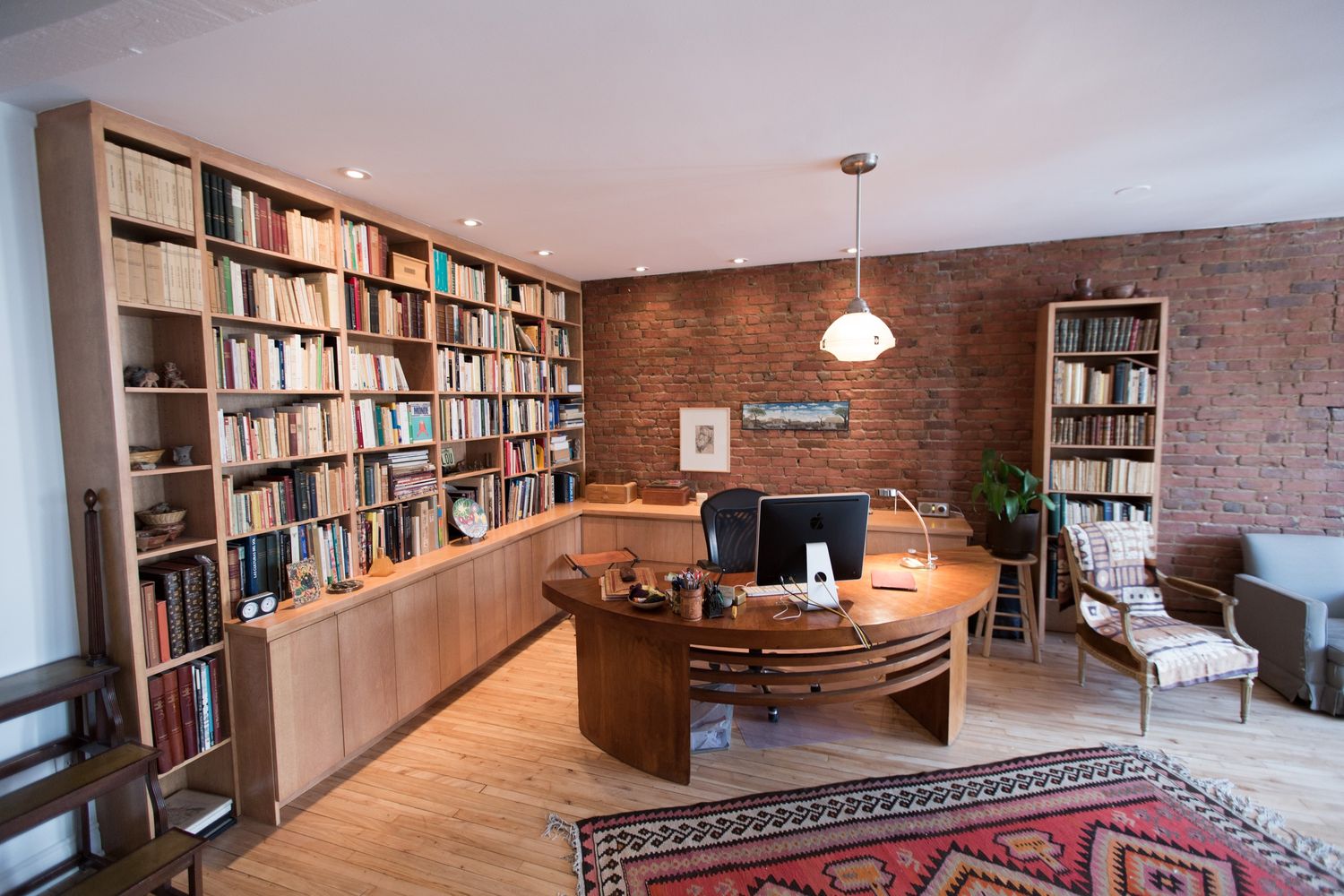 Dans cet appartement à l’ambiance feutrée, l’espace devait être revisité pour transformer la pièce centrale en bureau et la pièce avant en chambre d’escale, tout en faisant entrer plus de lumière. Habilement utilisé pour reconfigurer l’espace, le rangement intégré accueille la bibliothèque nourrie et les artéfacts de l’archéologue propriétaire. La simplicité des lignes et la chaleur du bois mettent en valeur les livres et objets, ainsi que le magnifique bureau art-déco. On a intégré à la bibliothèque du salon d’anciennes portes françaises vitrées pour laisser circuler la lumière. Séparant la pièce avant du vestibule, une commode-banc complémente l’entrée. Les fenêtres coulissantes givrées permettent à la lumière de pénétrer le vestibule tout en modulant l’intimité de la pièce avant.