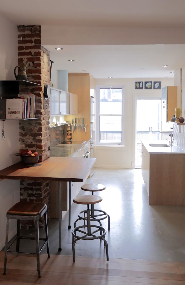 La cuisine exploite également diverses stratégies d’aménagement: centre de recyclage à quatre bacs, support coulissant pour huiles et sauces, panier en acier inoxydable à l’évier, garde-manger à tiroirs coulissants, dosseret émaillé en acier plié permettant de dégager le comptoir, tiroirs attenants à la surface de cuisson pour ranger ustensiles, épices et batterie de cuisine,…