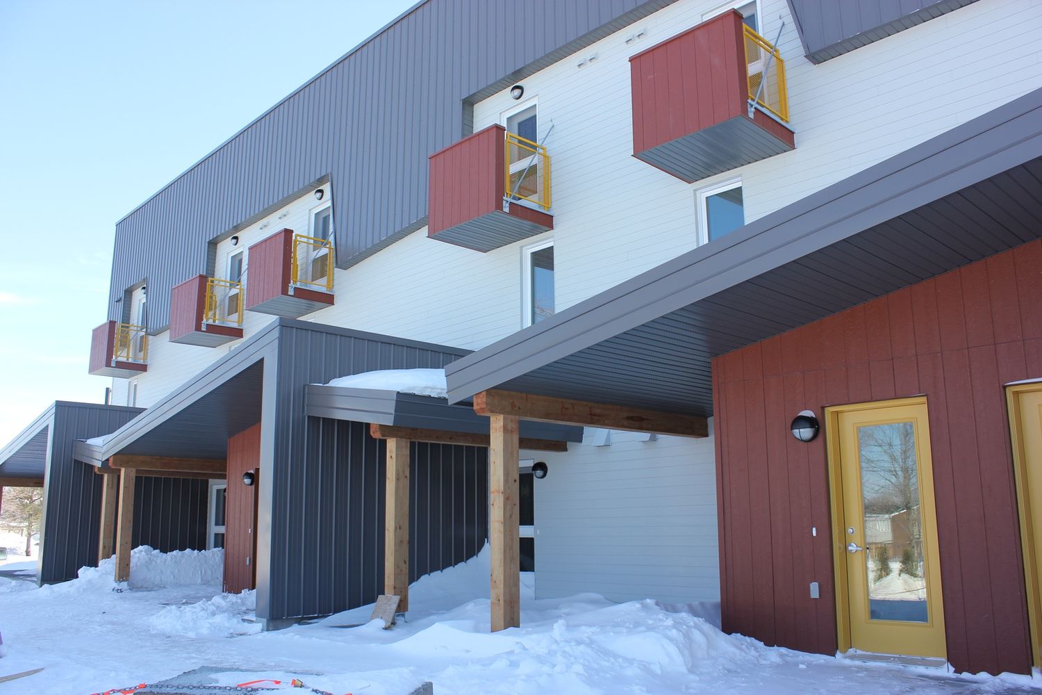 Destinée aux familles, aux personnes seules et aux personnes vivant avec une déficience intellectuelle, la première phase de ce projet résidentiel de trois immeubles de quarante logements sociaux qui comprend aussi un bâtiment communautaire a été terminée en 2015. Piloté par l’Office d’Habitation Rimouski Neigette (OHRN) et dessiné par la firme d’architecte Proulx-Savard, ce projet a aussi bénéficié des conseils d’Écohabitation, ce qui a permis de simplifier le design et d’améliorer son rendement thermique.