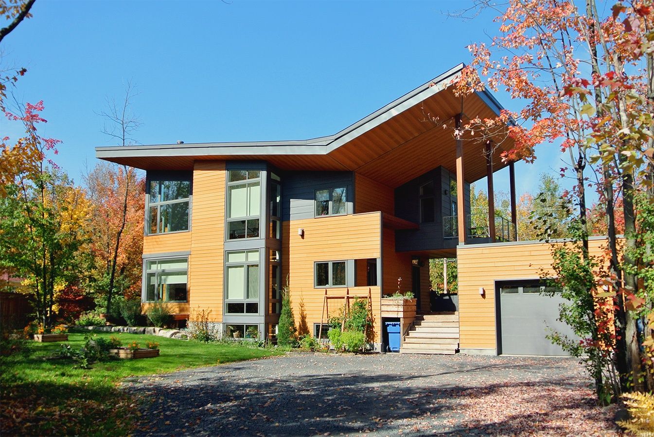 La Maison Carignan est située sur un magnifique site boisé à l’extérieur de la ville de Chambly. La maison est établie au coin nord-est d’une clairière existante pour profiter au maximum de son exposition au Sud tout en limitant la quantité d’arbres à enlever. Au Nord, elle se tourne vers la forêt alors qu'à l’Ouest, au Sud et au Sud-Est, elle regarde vers la clairière. L’aménagement des espaces s’est développé autour de la cuisine centrale, qui possède des vues sur toutes les pièces principales et sur la cour, et qui est liée aux espaces de services et de lavage. Le séjour de double hauteur relie les niveaux de la maison entre eux et connecte les espaces intérieurs avec la nature environnante, et aide la ventilation naturelle en créant un effet de cheminée. De profonds débords de toit, un treillis en surplomb et un écran en bois sur la cage d’escalier centrale contrôlent les rayons solaires estivaux, tandis qu’une terrasse d’entrée entre la maison et le garage/atelier permet un refuge ombragé. Une pompe géothermique et un plancher en béton poli distribuent la chaleur radiante dans la maison. Un réservoir récolte l’eau de pluie pour l’irrigation du terrain et pour la chasse d’eau des toilettes.