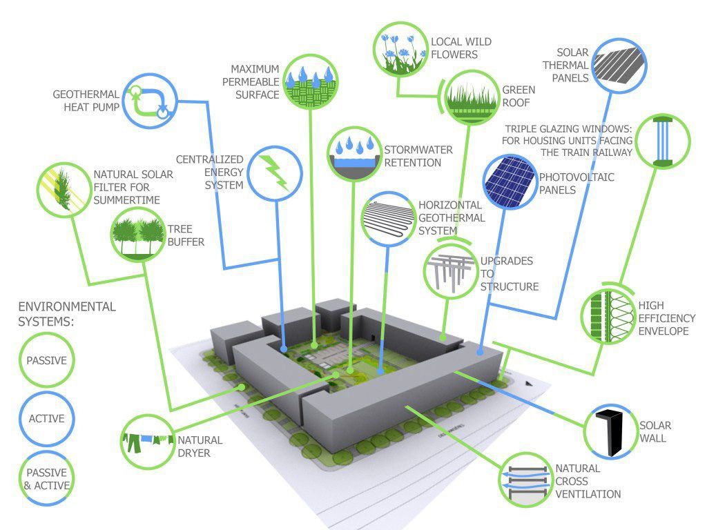Trois éléments confèrent un caractère écologique à ce projet : la densification du site, l'intégration des principes du TOD (transit-oriented development) et un bâti respectant les principes écologiques.