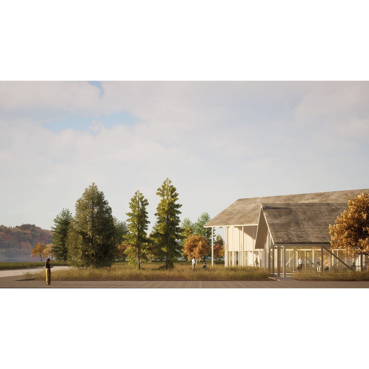 L'utilisation du bois comme matériau principal pour la structure et l'habillage extérieur reflète l'importance de l'industrie forestière locale. La toiture en chaume proposée à l'étape PFT assure une protection douce du bâtiment, tout en promouvant une approche écologique et respectueuse de l'environnement. Le choix de ce matériau se veut une intention afin d'honorer le patrimoine rural, mais cela n'est pas encore autorisé au Québec. Cela passerait par la recherche et l'innovation afin de répondre aux exigences modernes en matière de sécurité incendie et de durabilité.