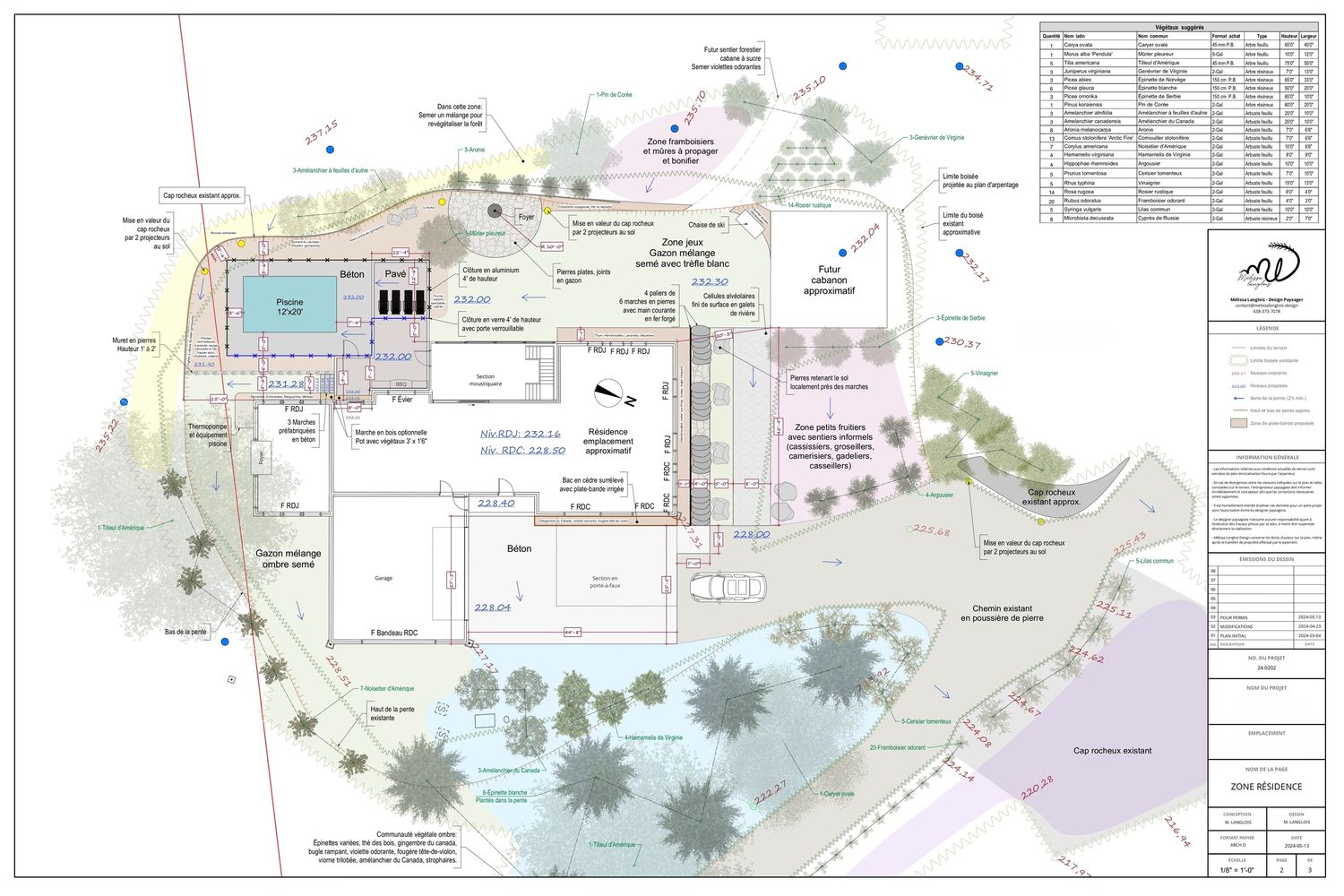 Le projet comprend la planification d’une piscine et d’un cabanon, judicieusement intégrés dans le paysage. Autour de la piscine, une zone de vie a été conçue pour maximiser le confort tout en optimisant l’utilisation de béton et de pavés. Une plate-bande, spécialement prévue près de la piscine et du cabanon, mettra en valeur des végétaux choisis pour leur résilience et leur faible impact environnemental. Le mélange de gazon enrichi de trèfle blanc nain et de graminées pour l’ombre assurera une couverture végétale durable, respectueuse de la biodiversité locale.